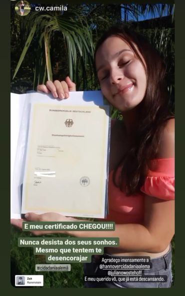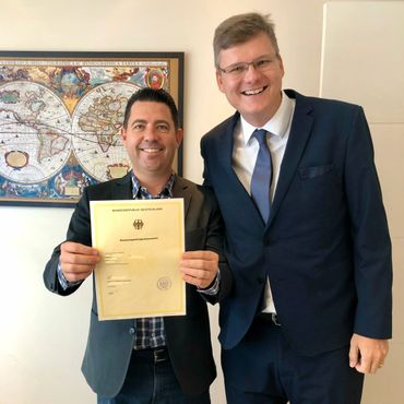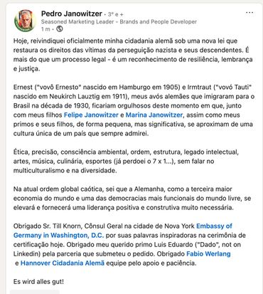 Um processo que para nós da minha família parecia tão distante devido ao fato da falta de documentos que não localizávamos, mas que com muito trabalho conseguimos obter, se tornou realidade no dia 20 de julho, exatos 11 meses após a entrada com pedido de cidadania no consulado alemão e hoje podemos afirmar que somos Alemães. Mais uma vez muito obrigado a todos da equipe Hannover pela perfeição e dedicação em seu trabalho.