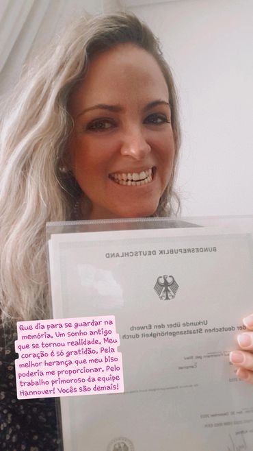 Gostaria de deixar aqui a minha recomendação sobre os serviços prestados pela Hannover. Sou do Rio de Janeiro e pesquei sobre a empresa na internet. Sem nenhuma recomendação (indicação) eu a contratei e acreditei! Sempre fui muito bem direcionada, respondida e acima de tudo foram muito honestos com tudo. Todas as documentações, separações, pesquisas. Isso é um processo e tanto, mas valeu cada segundo, cada incerteza de não conseguir a cidadania, cada valor investido. E se contar ninguém acredita que foram apenas aproximadamente 10 meses a partir da data de entrada no consulado. Hoje meu sonho se realiza e finalmente sou uma Cidadã Alemã! Obrigada a todos da Hannover por toda dedicação!